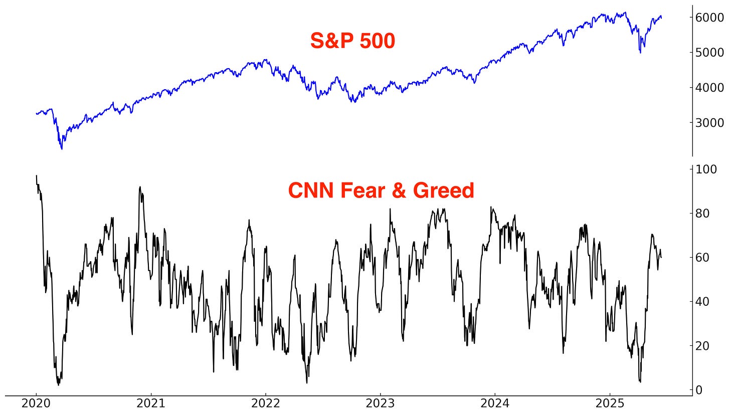 The CNN Fear & Greed indicator remains elevated, but isn’t in “extreme greed” territory: