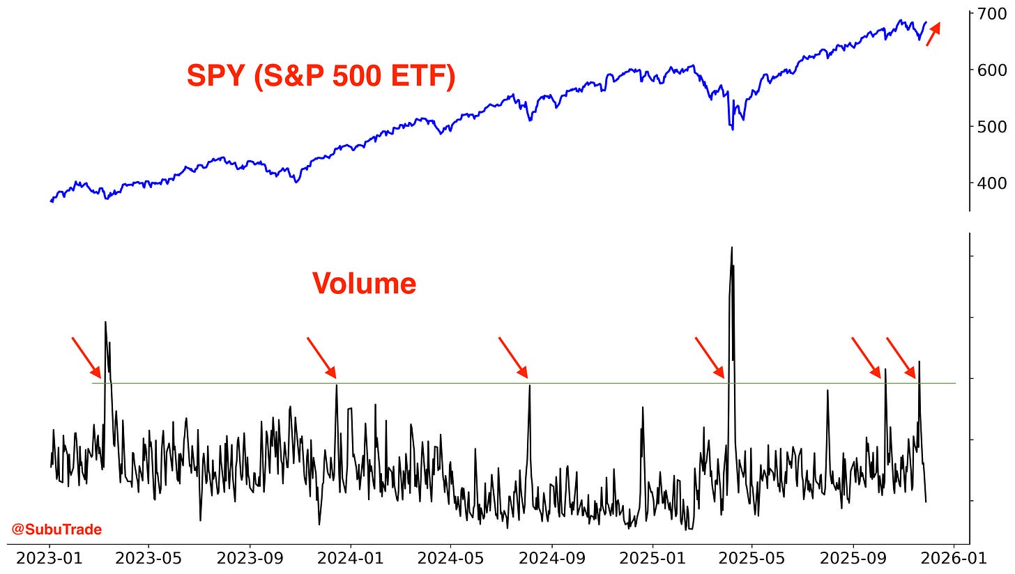 SPY volume spiked (volume tends to spike when markets fall):
