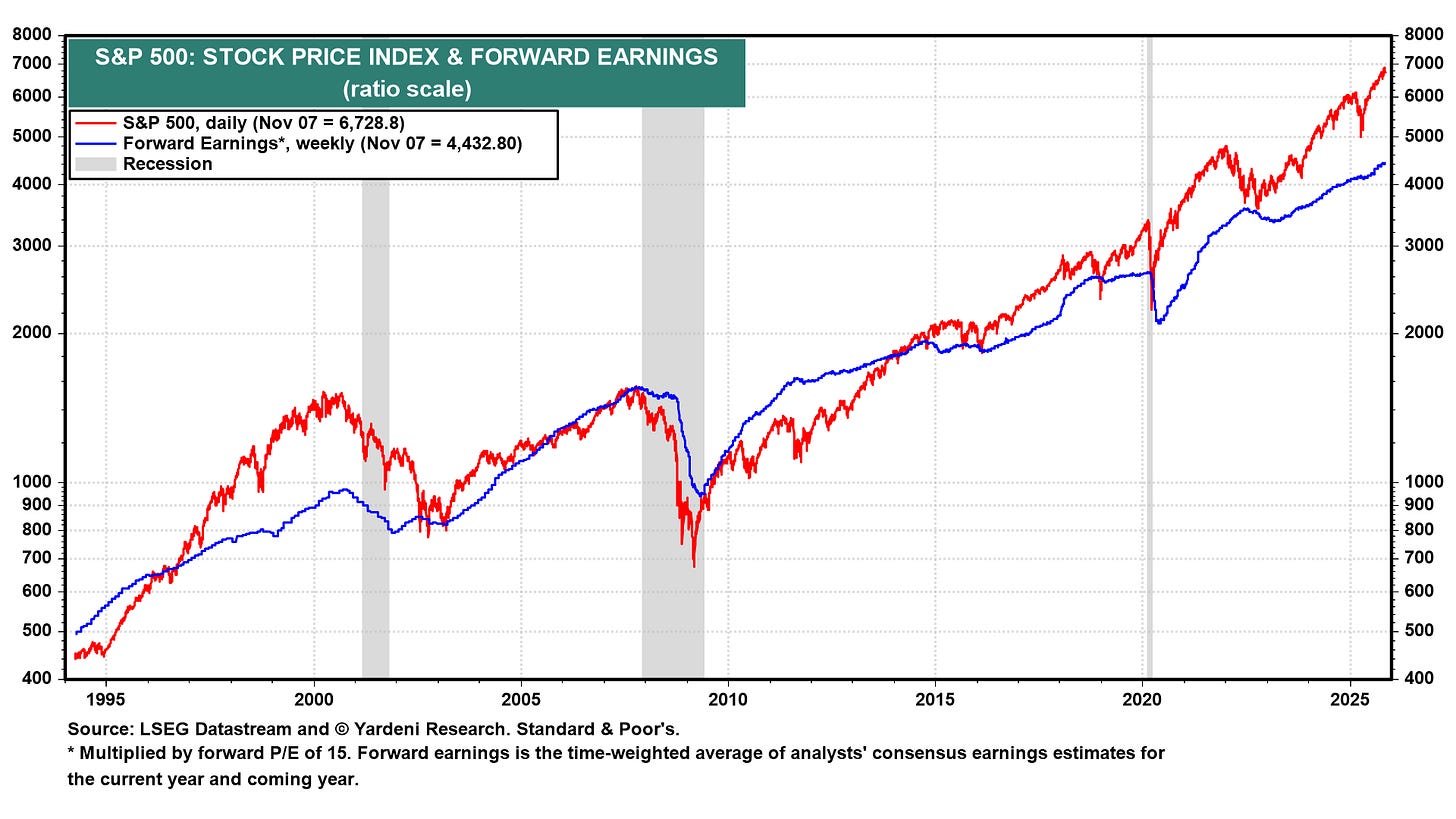 Here’s the S&P 500’s forward earnings. In the long run, earnings and stock prices move in the same direction. Earnings are still growing right now. But what if earnings growth slows down?