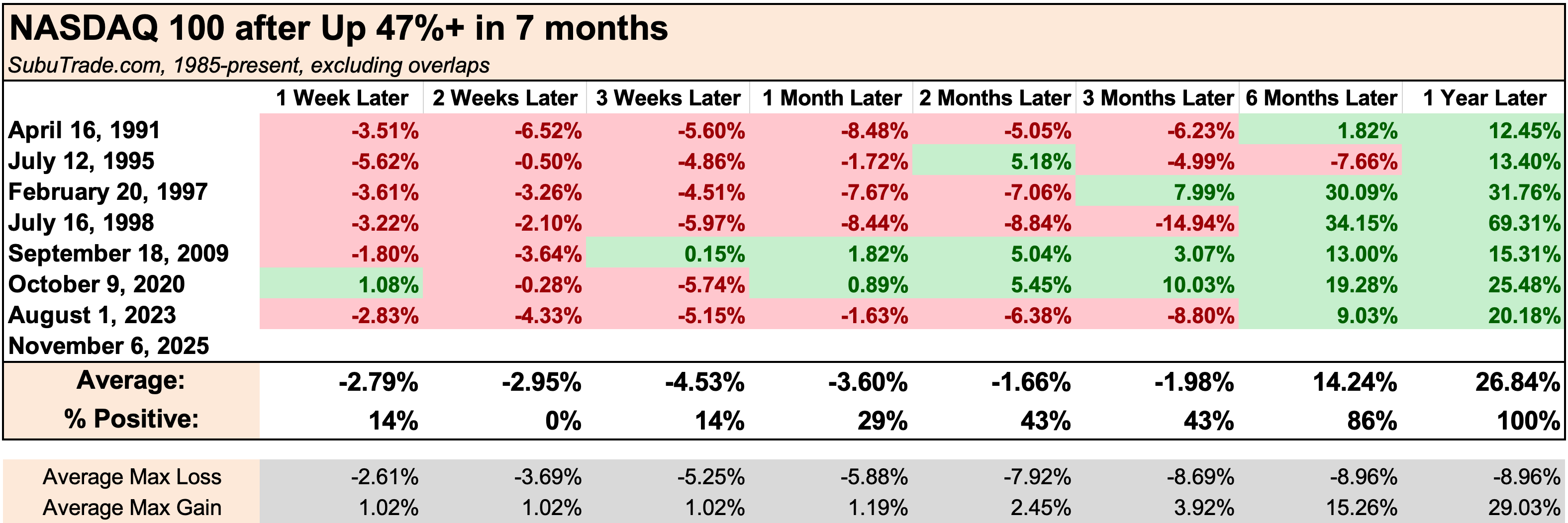 This tech-led rally has seen the NASDAQ gain +47% in the past 7 months. Such strong momentum is usually followed by short term losses, followed by more gains later: