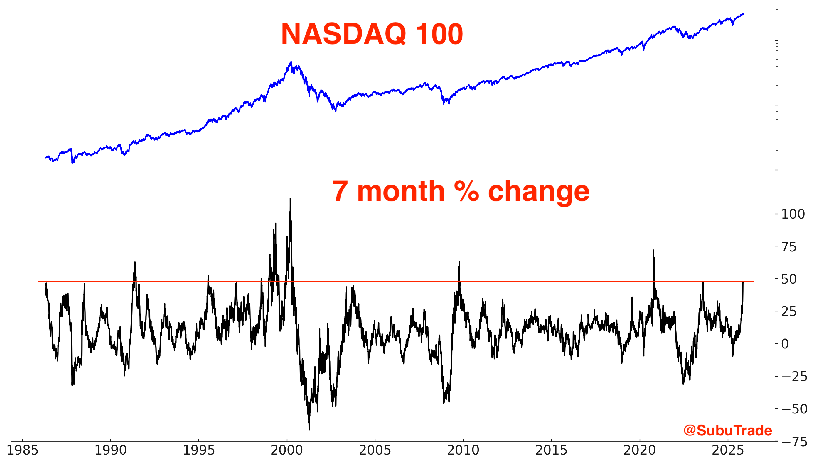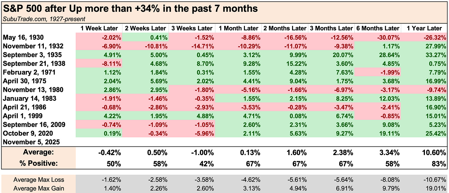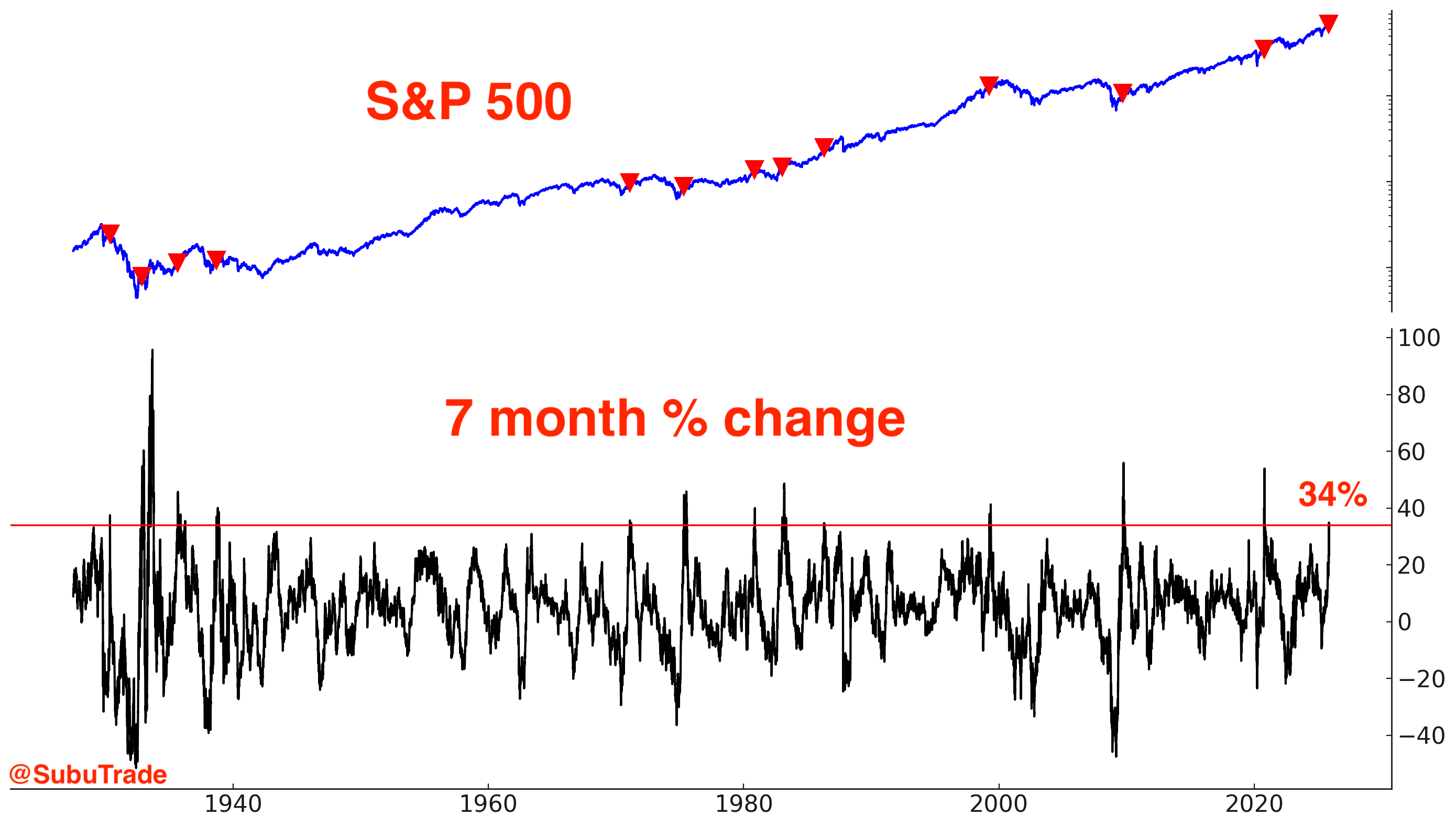 With a relatively narrow rally (the equal-weighted S&P has been flat since July), the S&P’s 7 month % change is at a less powerful +34%: