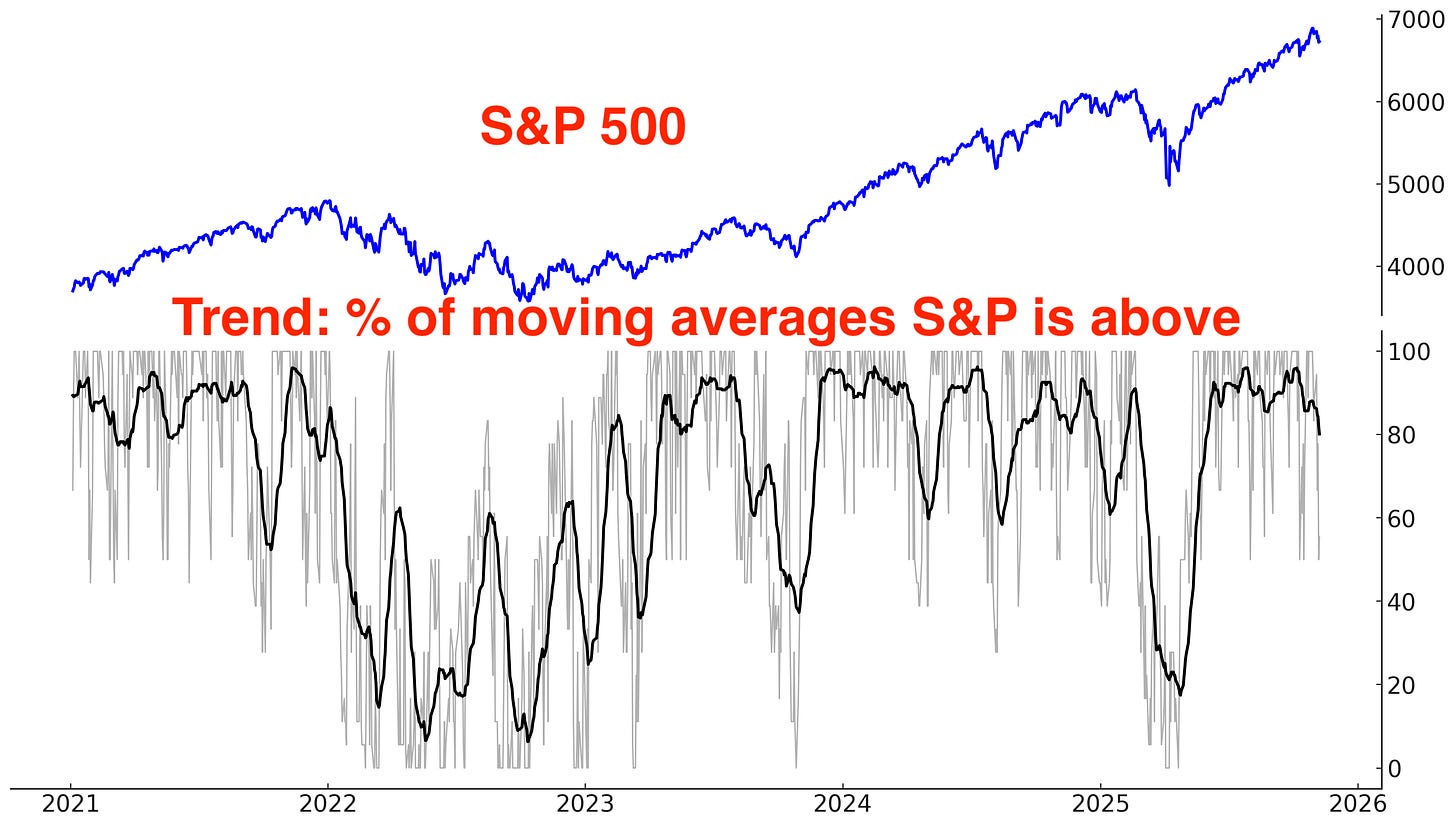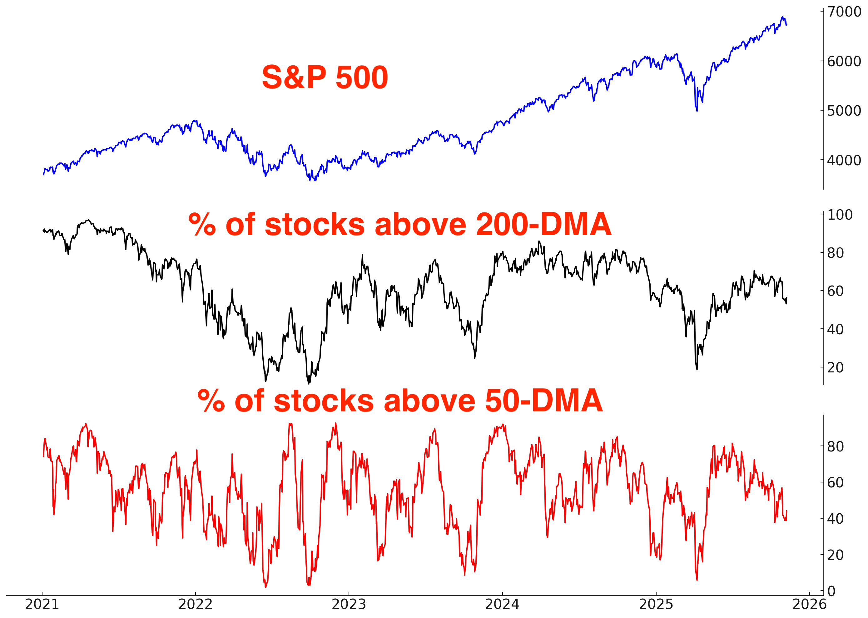 Here are the % of S&P stocks above their 200 and 50 day moving averages: