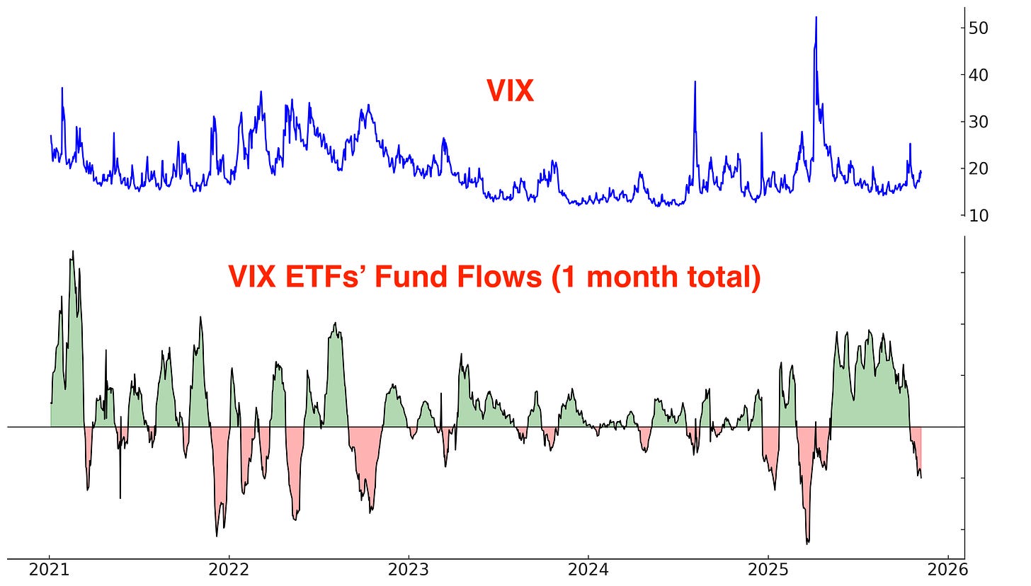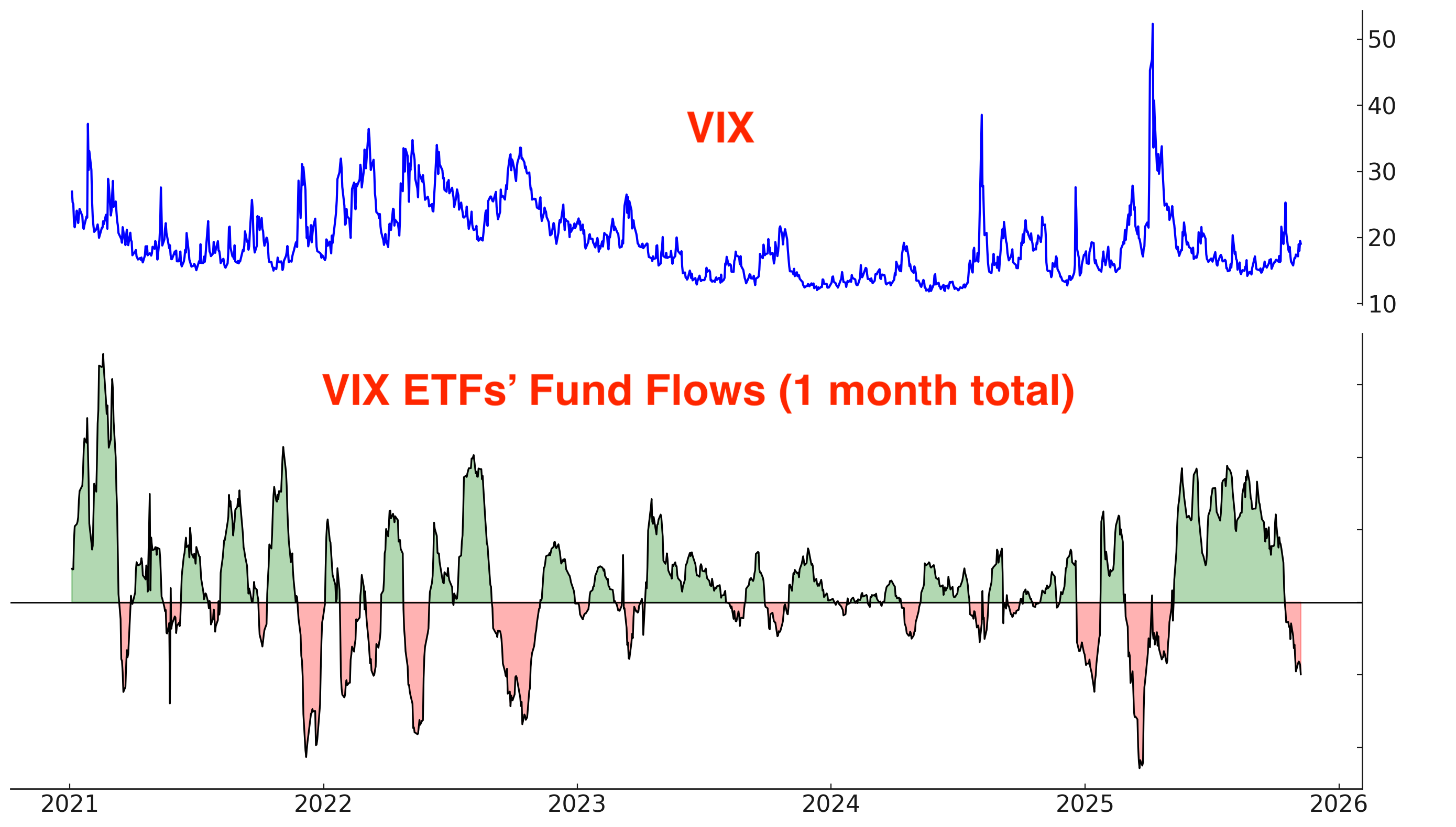 VIX ETFs are seeing outflows as traders take profits on their long-VIX ETF positions: