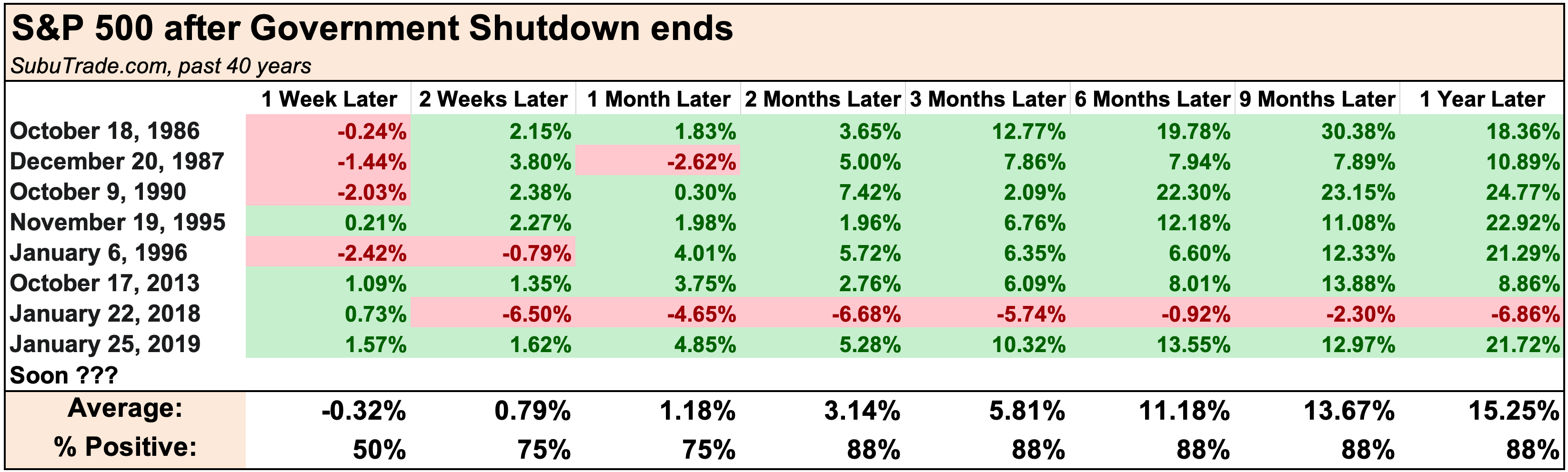 On an interesting side note, the government shutdown may be ending soon. Stocks have a tendency to rally after government shutdowns end. Treat this with a grain of salt: