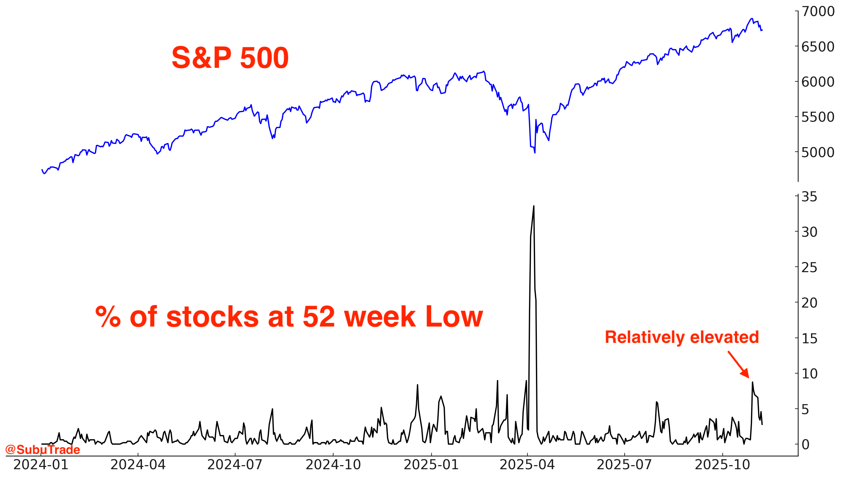 The Hindenburg Omen is one such indicator. Hindenburg Omens trigger when breadth is split: a relatively large % of stocks are at 52 week highs while a relatively large % of stocks are at 52 week lows.