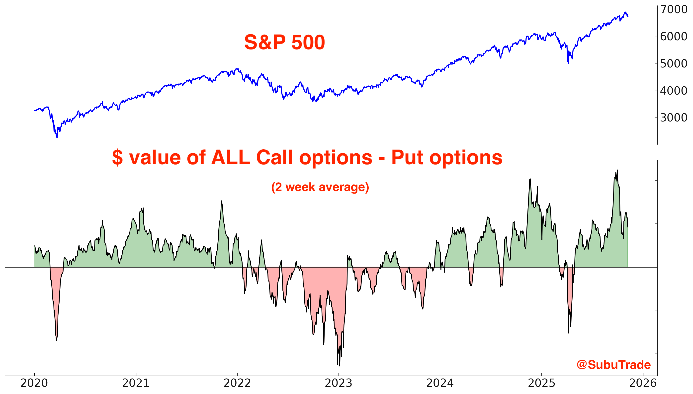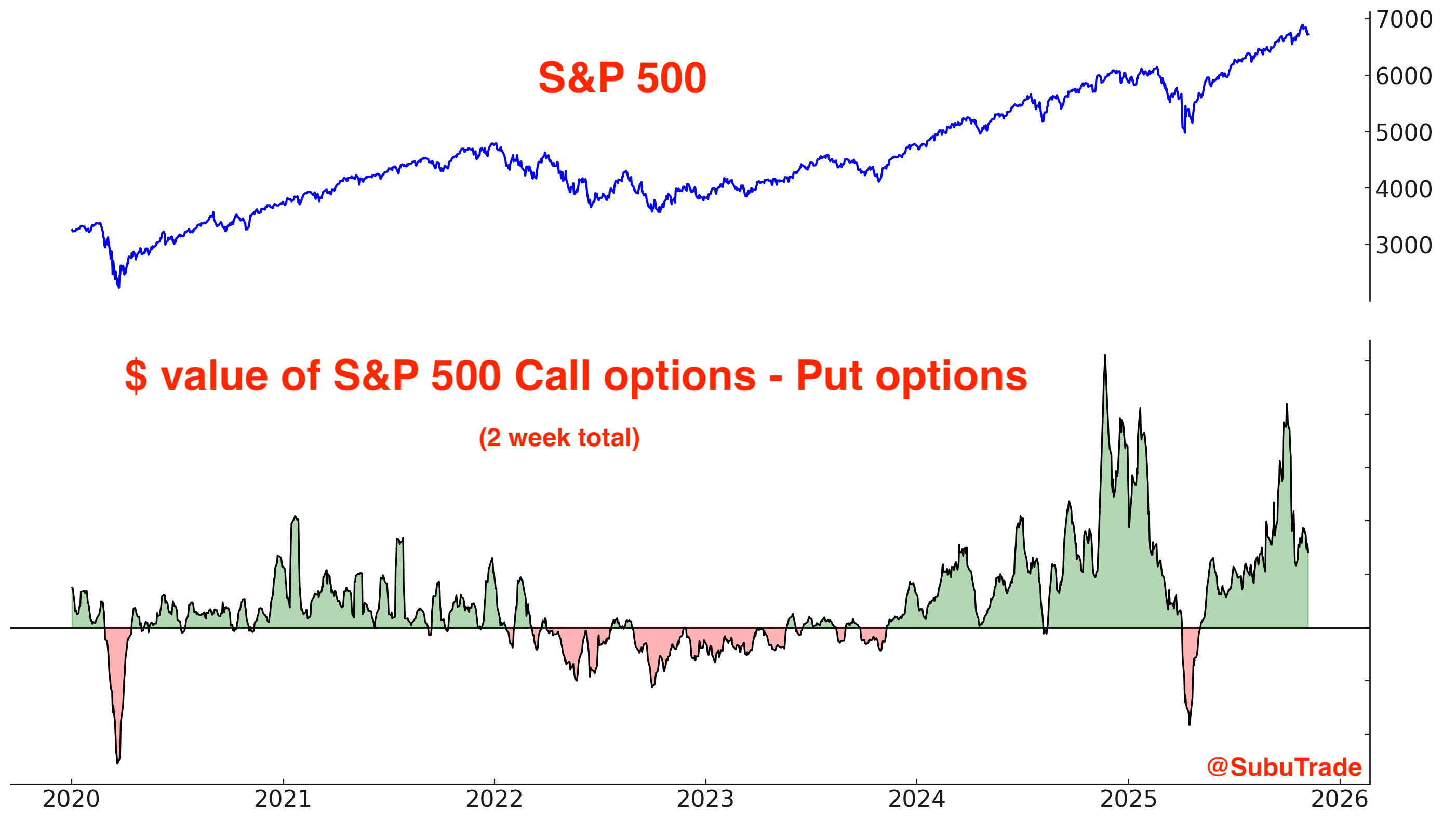 The market’s increased volatility over the past month reduced some speculative froth. The $ value of S&P 500 Call volume - the $ value of S&P 500 Put volume, which spiked, is now down to more normal levels:
