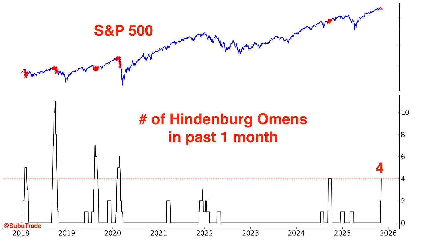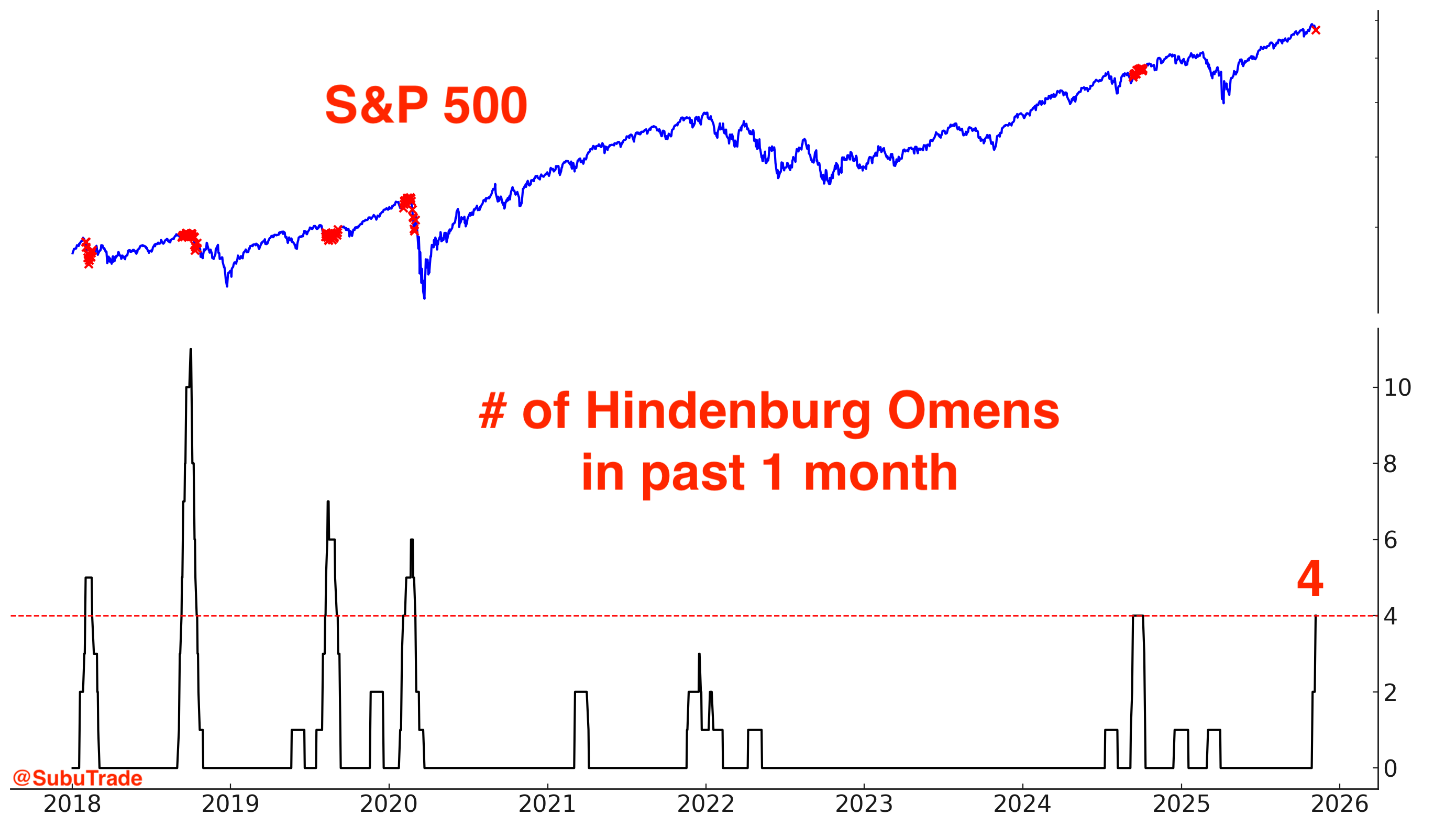 This past month has seen 4 Hindenburg Omens trigger already. This isn’t a perfect bearish signal. Sometimes Hindenburg Omens trigger too early. But this should at the very least raise some alarms in your mind.