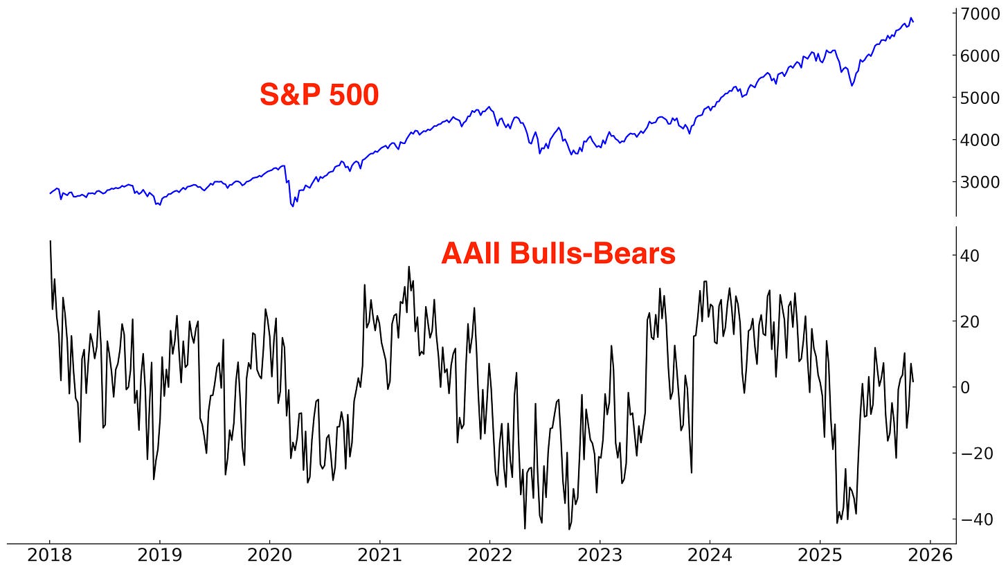 Sentiment according to the AAII survey is neutral. The AAII sentiment survey has been consistently less bullish than other sentiment surveys during this entire rally: