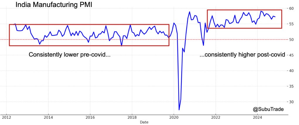 India’s manufacturing growth is reflected in its Manufacturing PMI, which has been consistently higher post-covid than pre-covid: