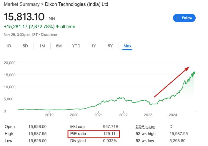 Hence, electronics manufacturing stocks in India like Dixon Technologies have exploded higher. Indian stocks have been in a correction over the past 2 months, but stocks that benefit from U.S.-China economic war like Dixon Technologies have not fallen at all. Investors BTFD. Dixon has a sky-high P/E ratio because analysts believe that Dixon will grow its profits by 50% a year for the next half decade: