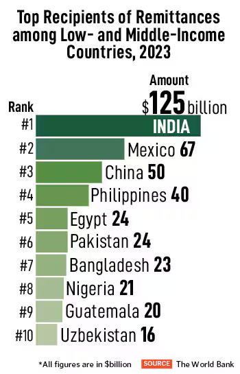 Massive foreign remittances from other nations to India. Indians living and working abroad are sending money back home to India.