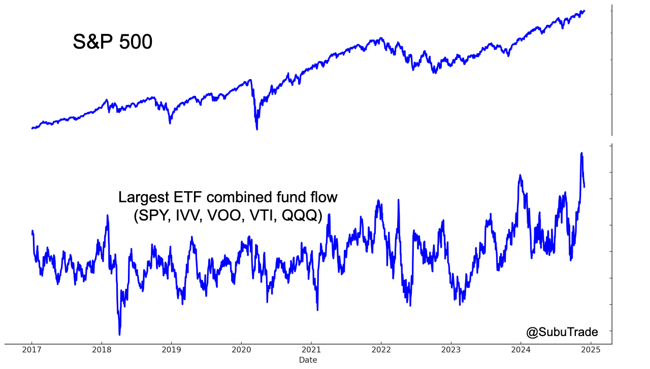 The past 2 months have seen massive flows into S&P and NASDAQ ETFs (SPY, IVV, VOO, VTI, QQQ):