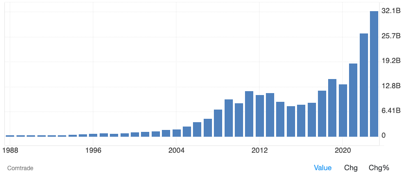 We can see this in several data series. As China’s manufacturing moves to India, India’s electronics exports is exploding. The following chart from TradingEconomics includes yearly data as of 2023. 2024 has seen further growth, which companies like Apple expanding their manufacturing in India by 30-40% per year: