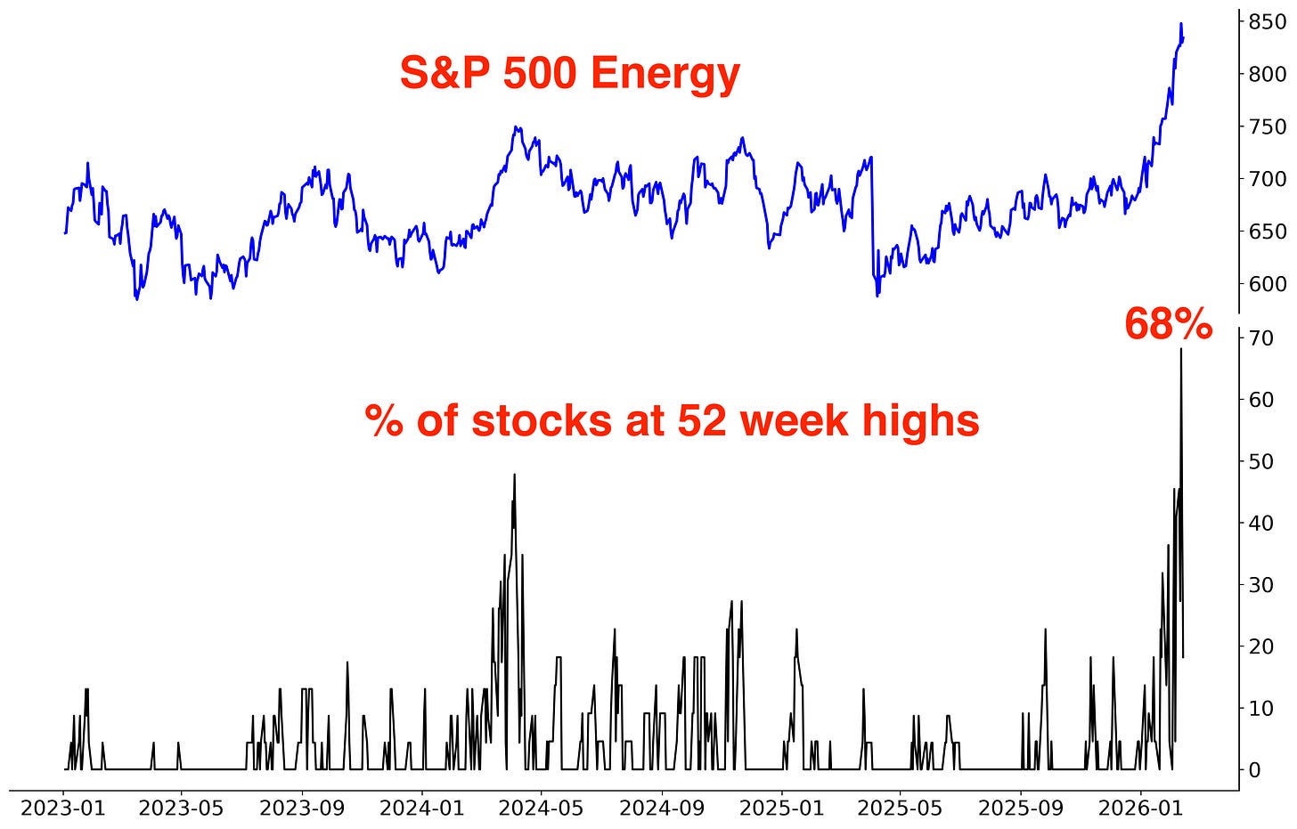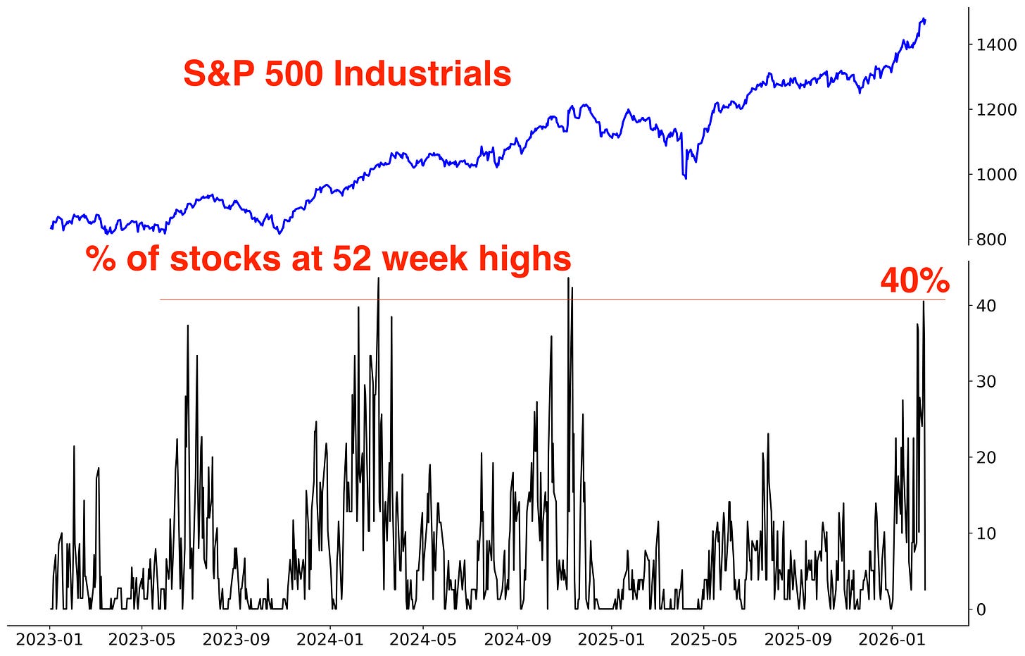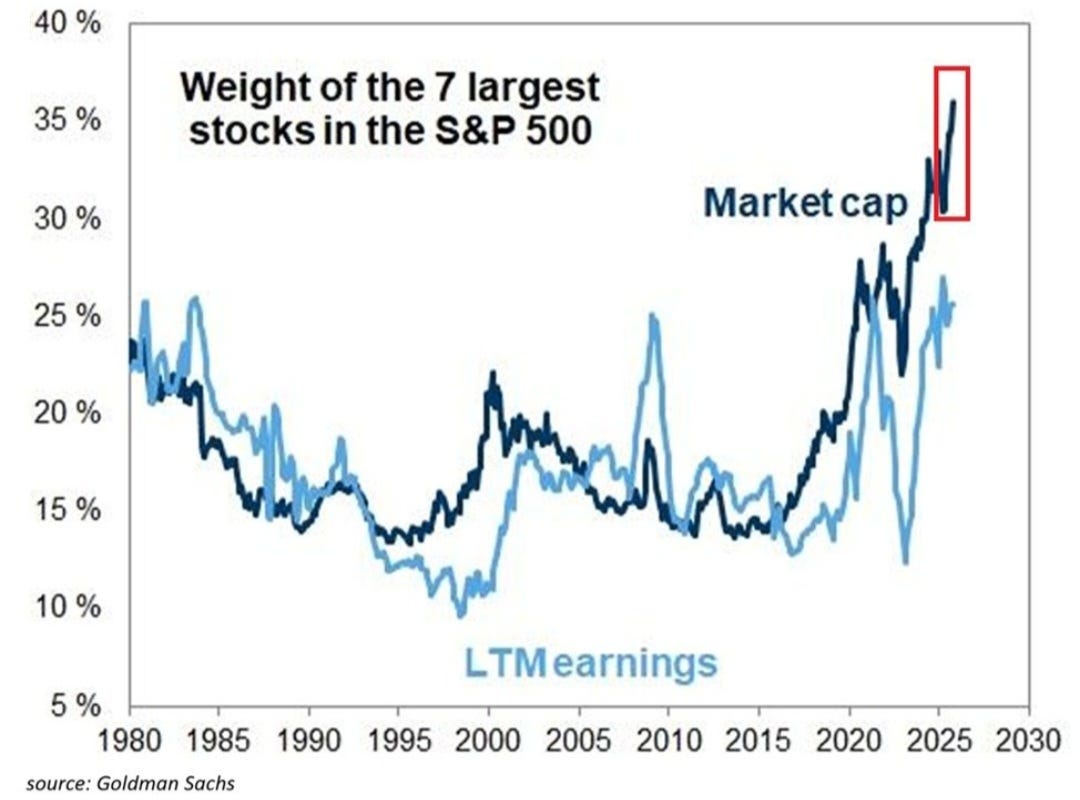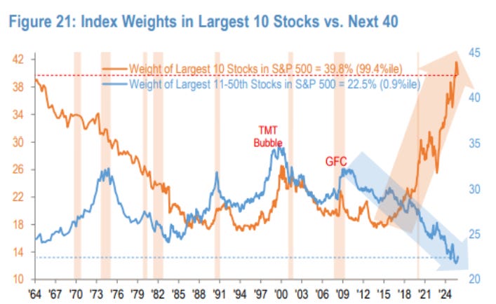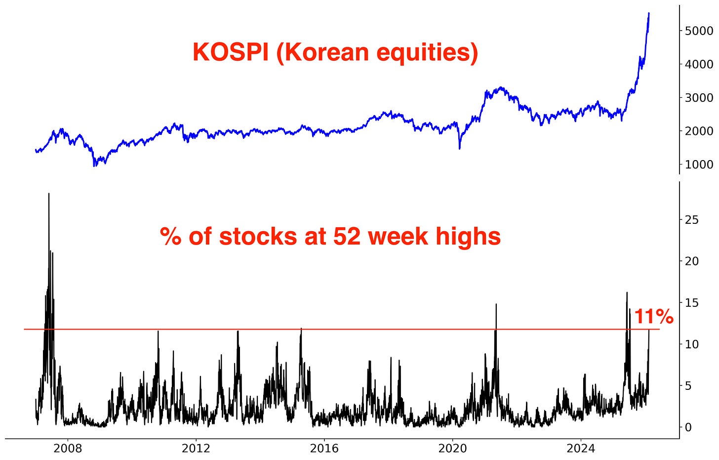 An extreme example is South Korea. On the back of the AI and memory boom, a handful of stocks have driven nearly the entire move. Just a few companies account for almost half of the KOSPI. In markets this concentrated, “breadth” matters less. All that matters is what the top 5 stocks are doing.