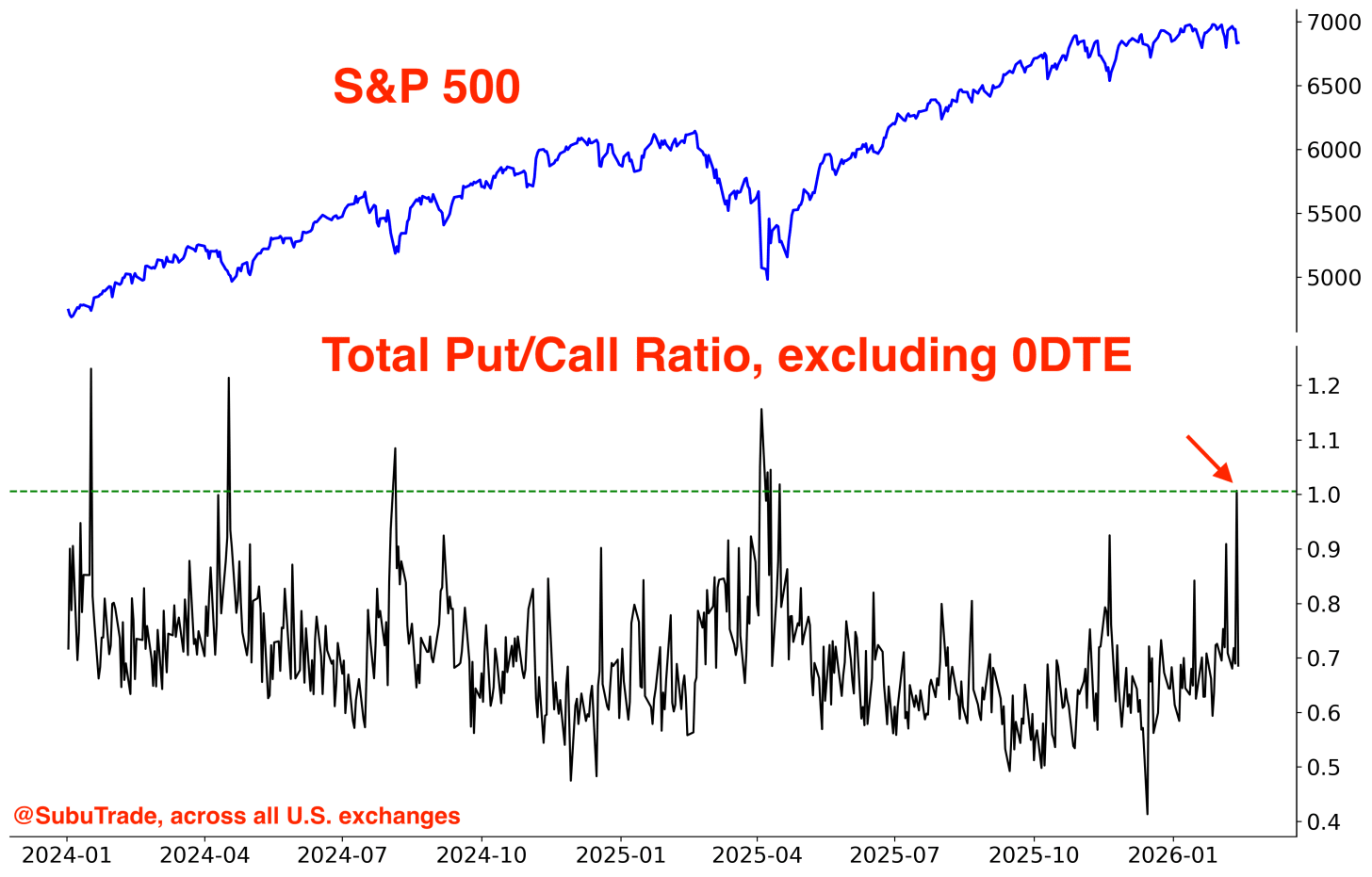 And no, the spike in Put/Call is not just because of 0DTE’s. Here’s the same indicator, excluding 0DTE’s: