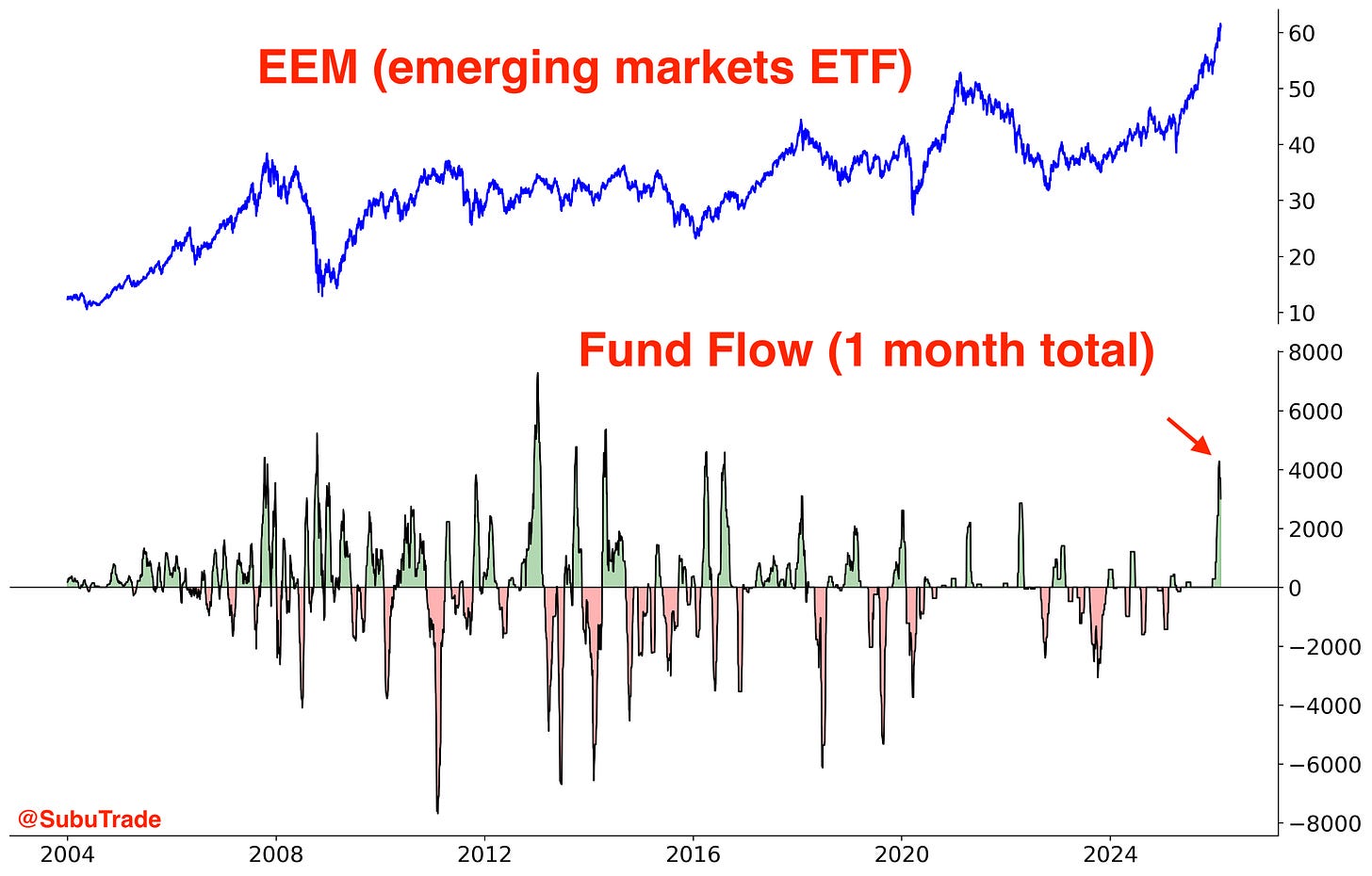 Emerging markets are a good example. EEM has seen its highest inflows in nearly a decade.