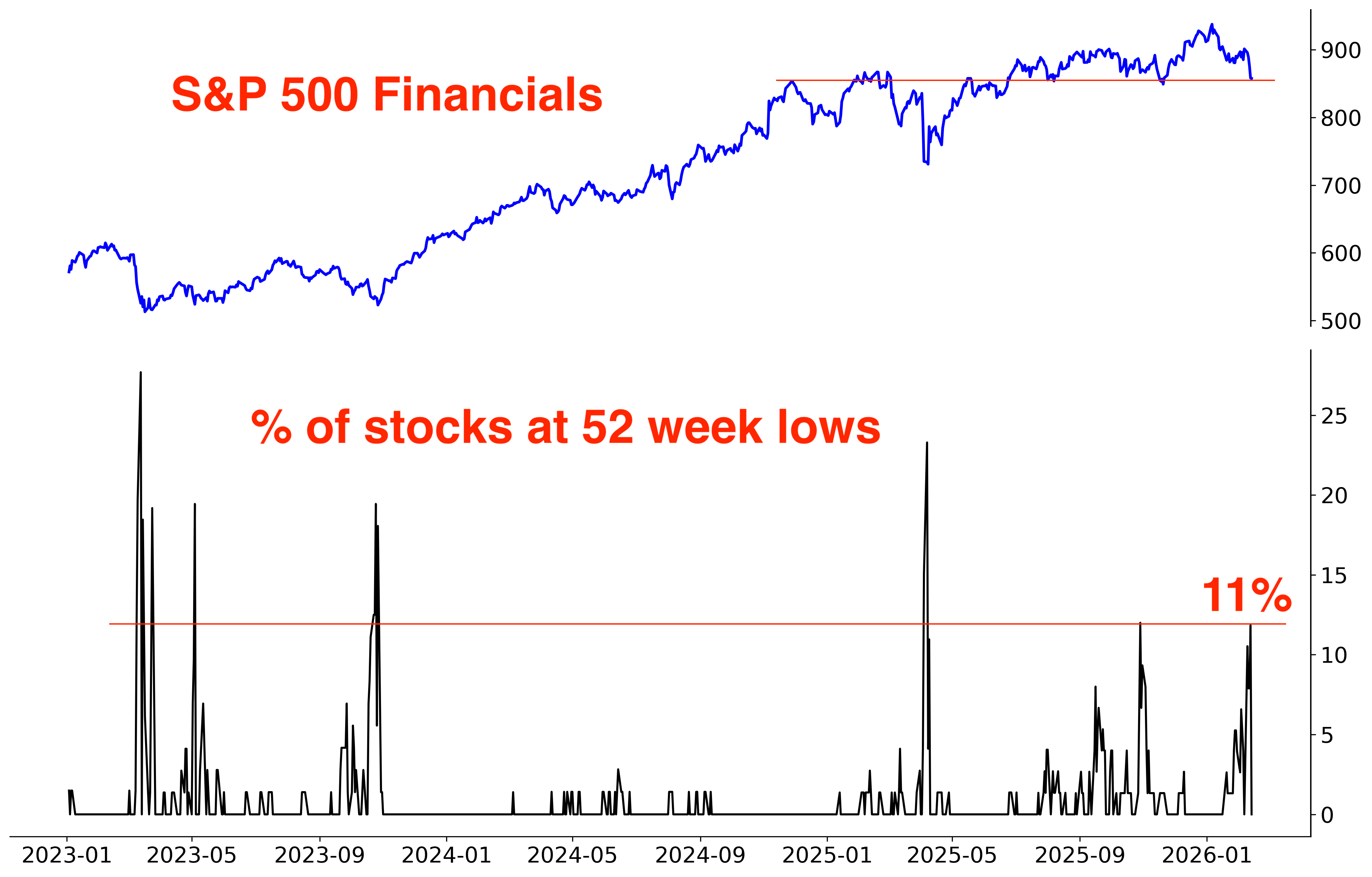 Large-cap tech (MAGS) is roughly back to its September 2025 levels and software stocks (IGV) have sharply declined.