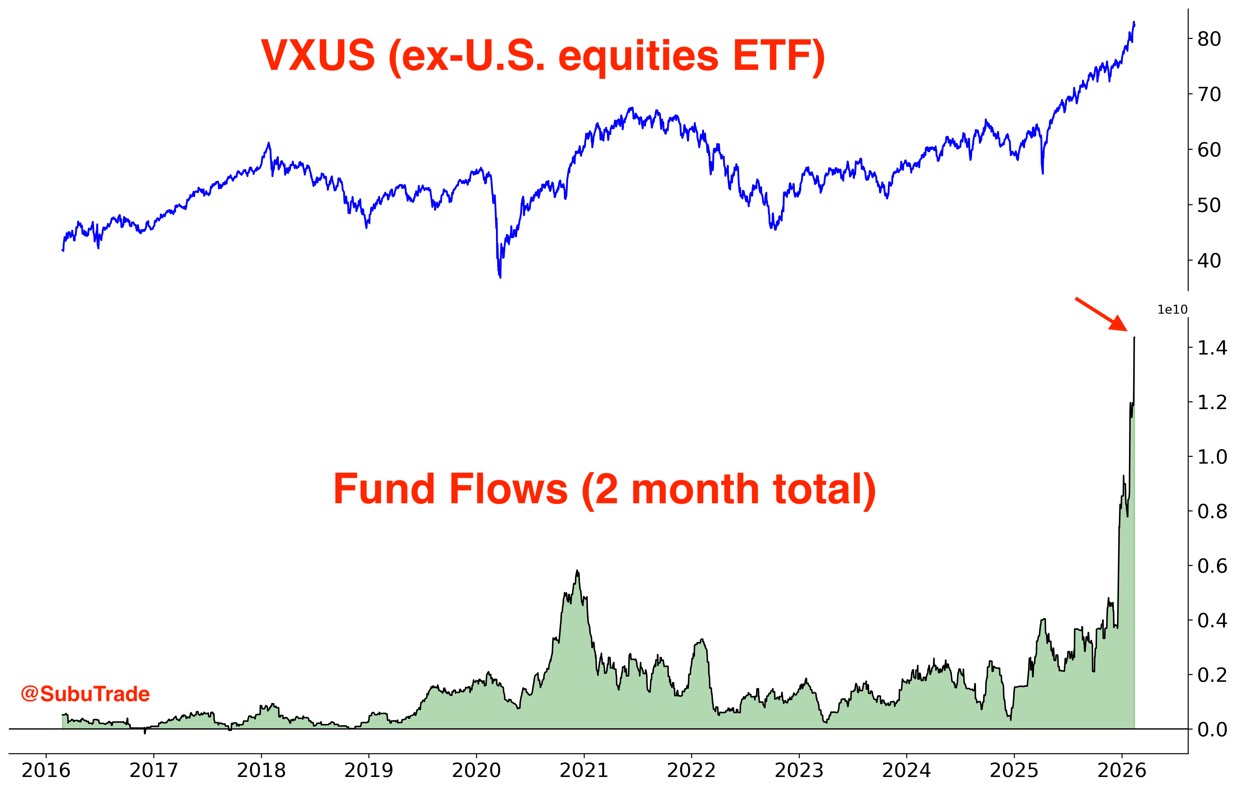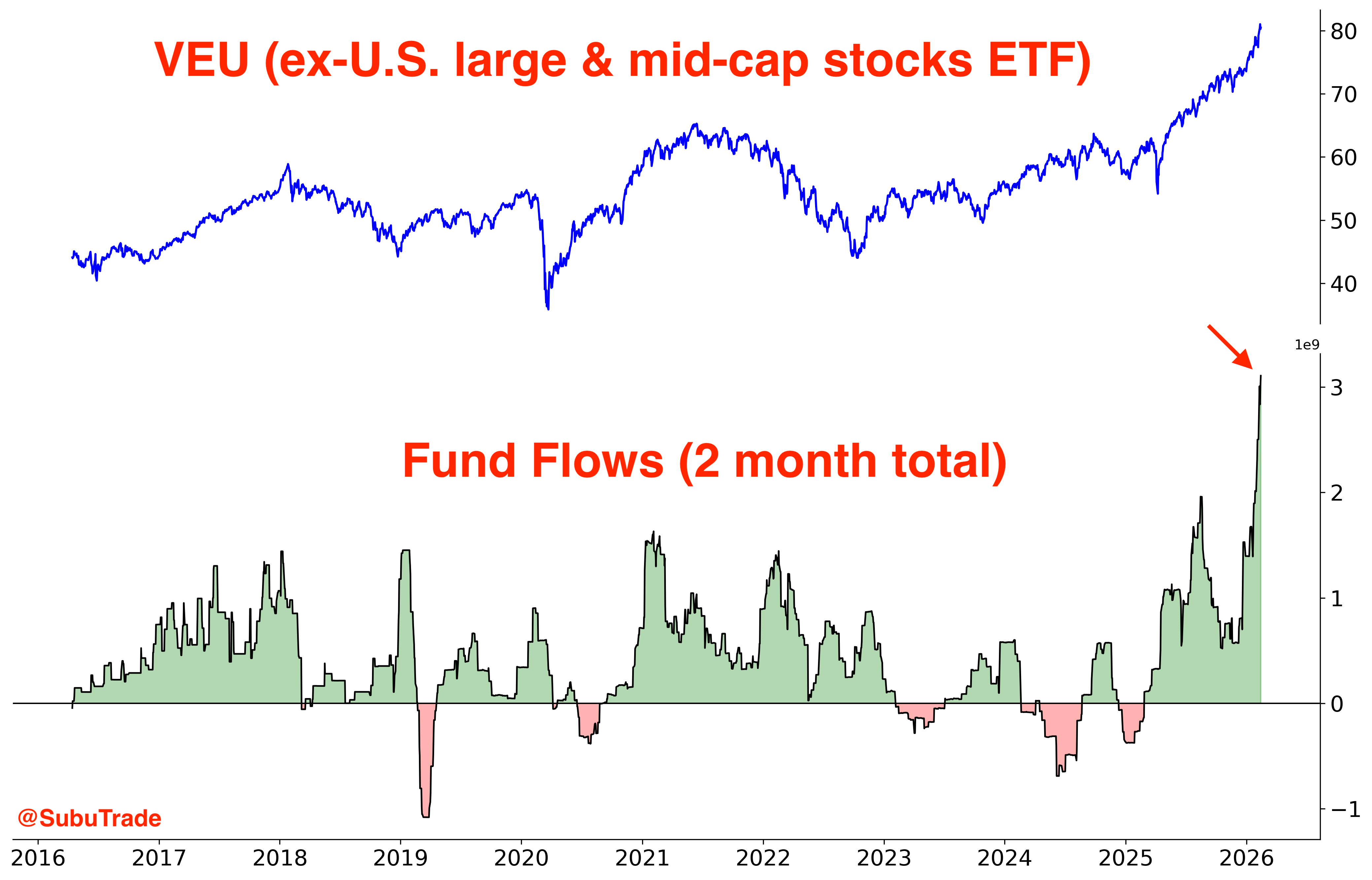 Massive inflows into ex-U.S. equities (large, mid, and small caps):