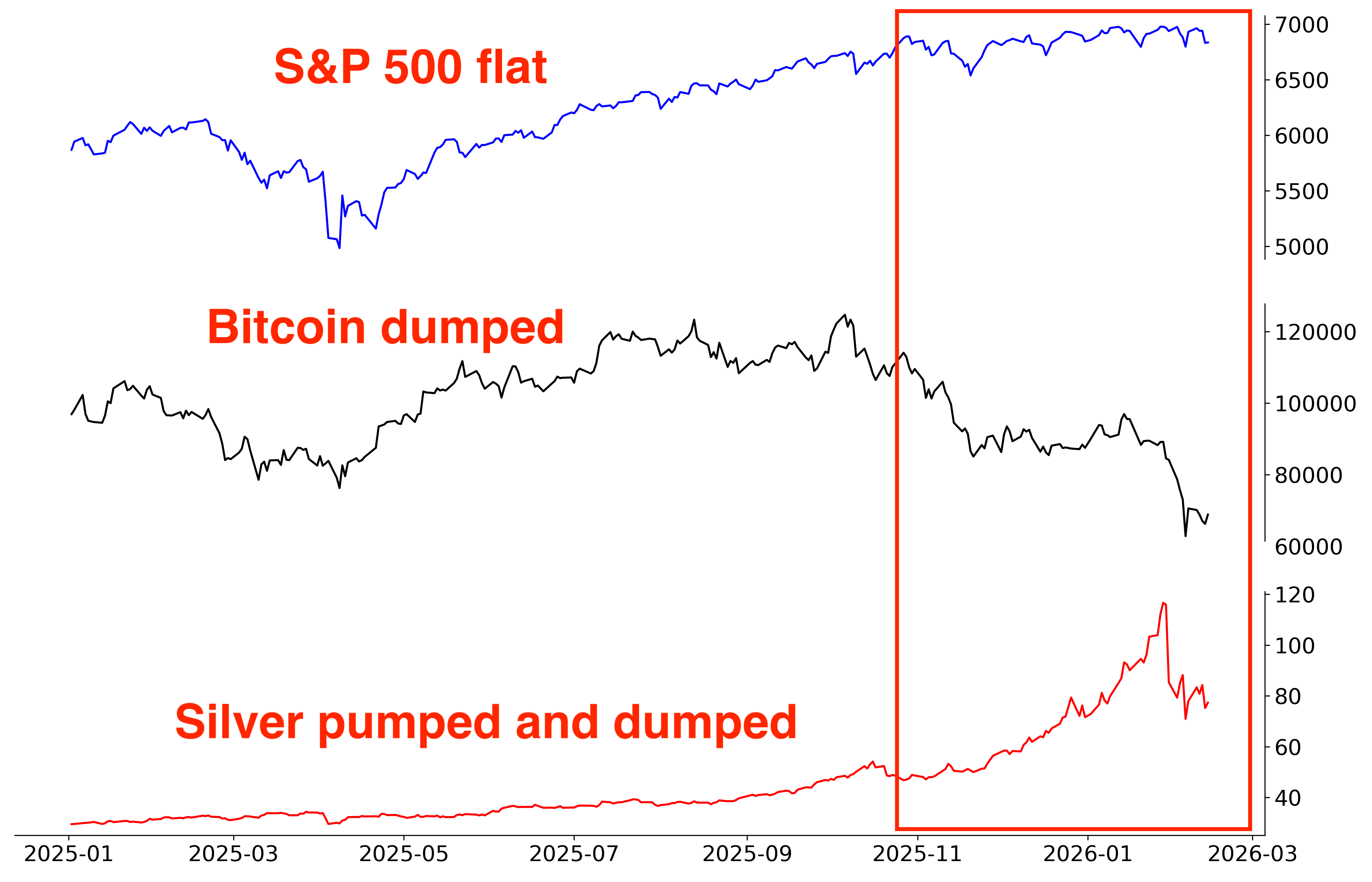 Silver pumped and dumped. Its parabolic surge really began in late-October, right as major U.S. indices peaked. Silver was an obvious target for the herd to pump. Silver is a much smaller market than gold and lagged significantly, with the Gold/Silver ratio near 90 (no historical precious metals bull market ended with such a high Gold/Silver ratio). Capital rotated in, pushed silver to the moon, and then left in a hurry.