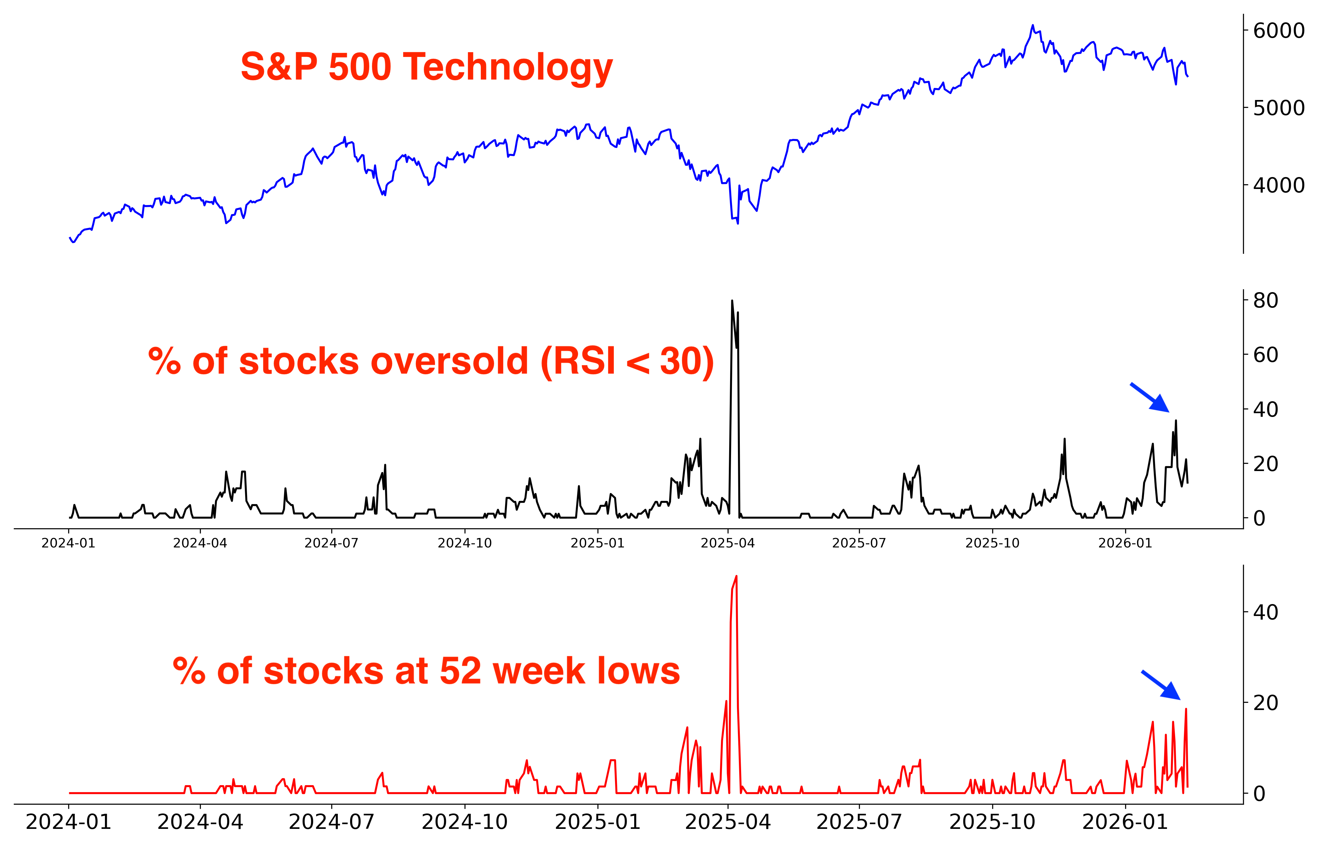Scenario 2: Software and large-cap tech rebound from oversold conditions and rejoin the broader advance. In my view, this is the more likely path.